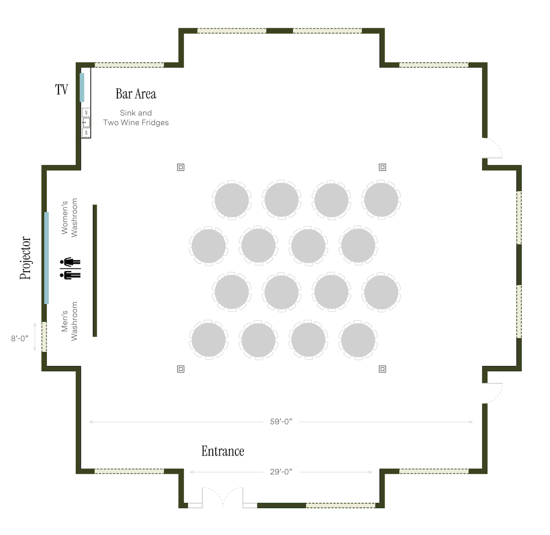 Our space can comfortably accommodate 160 people seated, and 200 standing. Rates include 20 tables and chairs to seat 8 people per table.